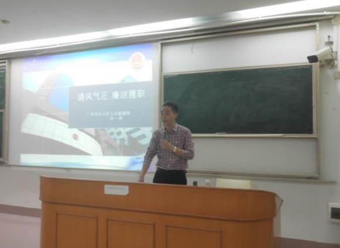 讲座邀请白云区人民检察院一级检察官许一思,围绕“典型贪腐案例展示、贪腐犯罪法律规定、贪腐犯罪成因分析、贪腐犯罪预防对策”四个方面进行分析。许一思剖析了当前反腐倡廉的形势和任务,应用经典贪腐案例,告诫听众们反腐倡廉建设具有长期性、复杂性、艰巨性,这意味着形成优良作风不可能一劳永逸,克服不正之风也不可能一蹴而就。
