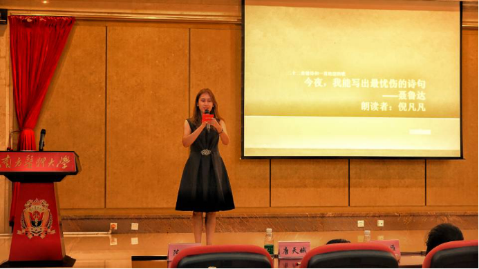 最后的朗读环节,谢婉仪同学朗诵的《千禧》轻抚人心,感人肺腑,是对未来勇敢探索的赤子丹心;刘知毅同学朗诵的《我要往前走》情感真挚,语调悠扬,是对爱情执着追求的勇气;倪凡凡同学朗读的《二十二首情诗和一首绝望的歌》缓缓述说,深沉感人,是对爱情炙热地追求。精心准备的PPT,恰到好处的音乐与朗诵交相辉映,选手饱含感情的朗诵给所有人带来了一场视觉和听觉上的盛宴。