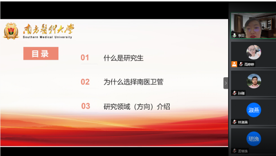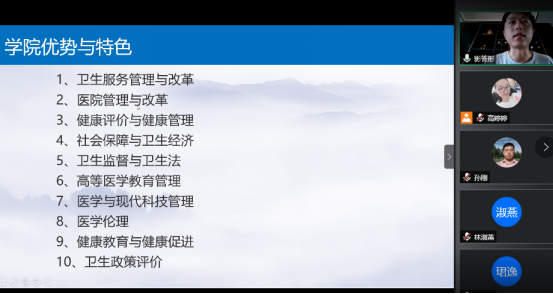 随后,学院教授张持晨对学院优势与特色、学科导师情况进行了重点介绍。管理系副主任李贝从“什么是研究生”引发思考、“到为什么选择南医卫管”,再详细讲解了公共管理专业研究领域(方向)。在交流环节导师和优秀同学们就学科特色、校园生活、科研学术、心得体会等方面进行了广泛的经验分享与思想交流,加深了同学和导师的彼此了解。