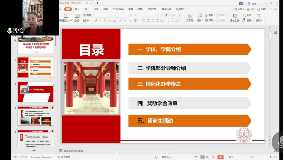 钱怡希望同学们通过夏令营活动,能够对自身未来发展和人生规划有更多的思考,通过夏令营充分展现自己的风采。为达到“远隔千里,近在眼前”的效果,带领大家一起“云享”南方医卫生管理学院,共同观看了学校和学院的宣传视频。