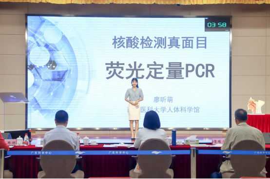 我校科研院推荐的人体科学馆科普讲解员廖昕萌是广州代表队中高校科研院所组唯一一名学生科普讲解员,廖昕萌从半决赛中脱颖而出,成功晋级总决赛。廖昕萌讲解主题为“核酸检测的真面目——荧光定量PCR”,她借助道具,为大家讲解为什么通过鼻咽拭子可以检测新冠病毒?带领大家了解检测原理,廖昕萌将PCR技术比喻成一个精准的复印过程,把病毒的RNA看作是一本需要复印的书,那么技术中所用的引物就是特异的书签,DNA聚合酶就是复印机的打印喷头,dNTP就是4种不同颜色的墨水,荧光探针就是根据新冠病毒的特异性核酸序列而设计的荧光书签。在复印过程中,荧光书签怎样找到自己对应的页码?怎样检测出新冠病毒?廖昕萌同学用自己独特的风格和表现形式让战疫科技背后的科学原理变得深入浅出,通俗易懂,她的讲解赢得了观赛者和评委的一致好评,最终荣获大赛三等奖。