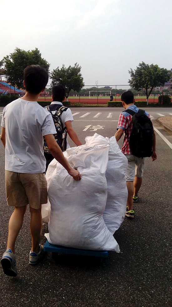校青协在各宿舍楼的负责人带着志愿者们一起整理物资,将箱子中的衣物整理成袋,由搬运的志愿者搬运到暂存的仓库,等待项目组回收。负责整理和搬运的志愿者表示“虽然衣物很多很重,但能在累与苦中感受到快乐”。