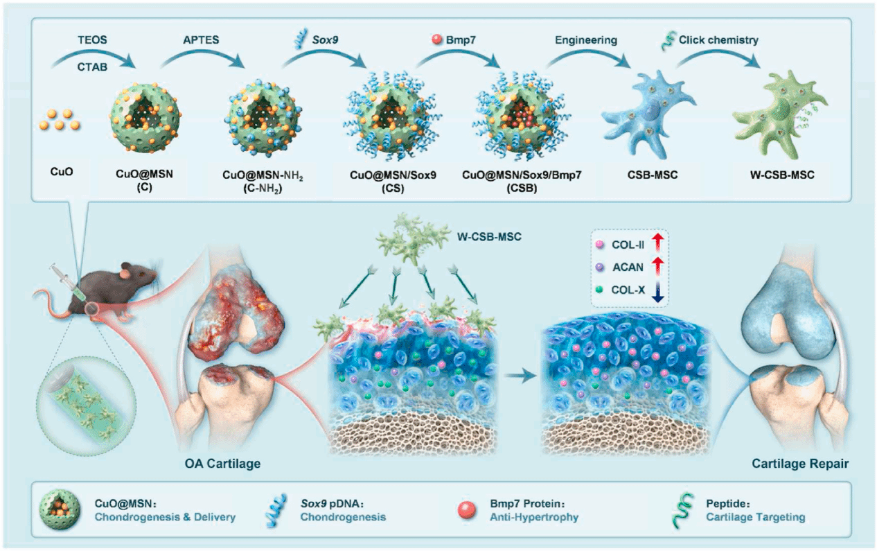 团队创新性开发了一种铜基纳米颗粒(CuO@MSN)与软骨靶向肽(WYRGRLCCCC)双重修饰的间充质干细胞(MSCs)工程策略。该纳米颗粒可递送Sox9基因和Bmp7蛋白,分别促进MSCs软骨分化并抑制肥大化;靶向肽修饰则显著提升MSCs在关节腔和软骨组织的驻留能力。动物实验及临床OA患者软骨样本验证显示,双重修饰的MSCs可高效促进透明软骨再生,减少血管化和钙化。该研究为干细胞治疗OA的临床转化提供了关键技术支撑。