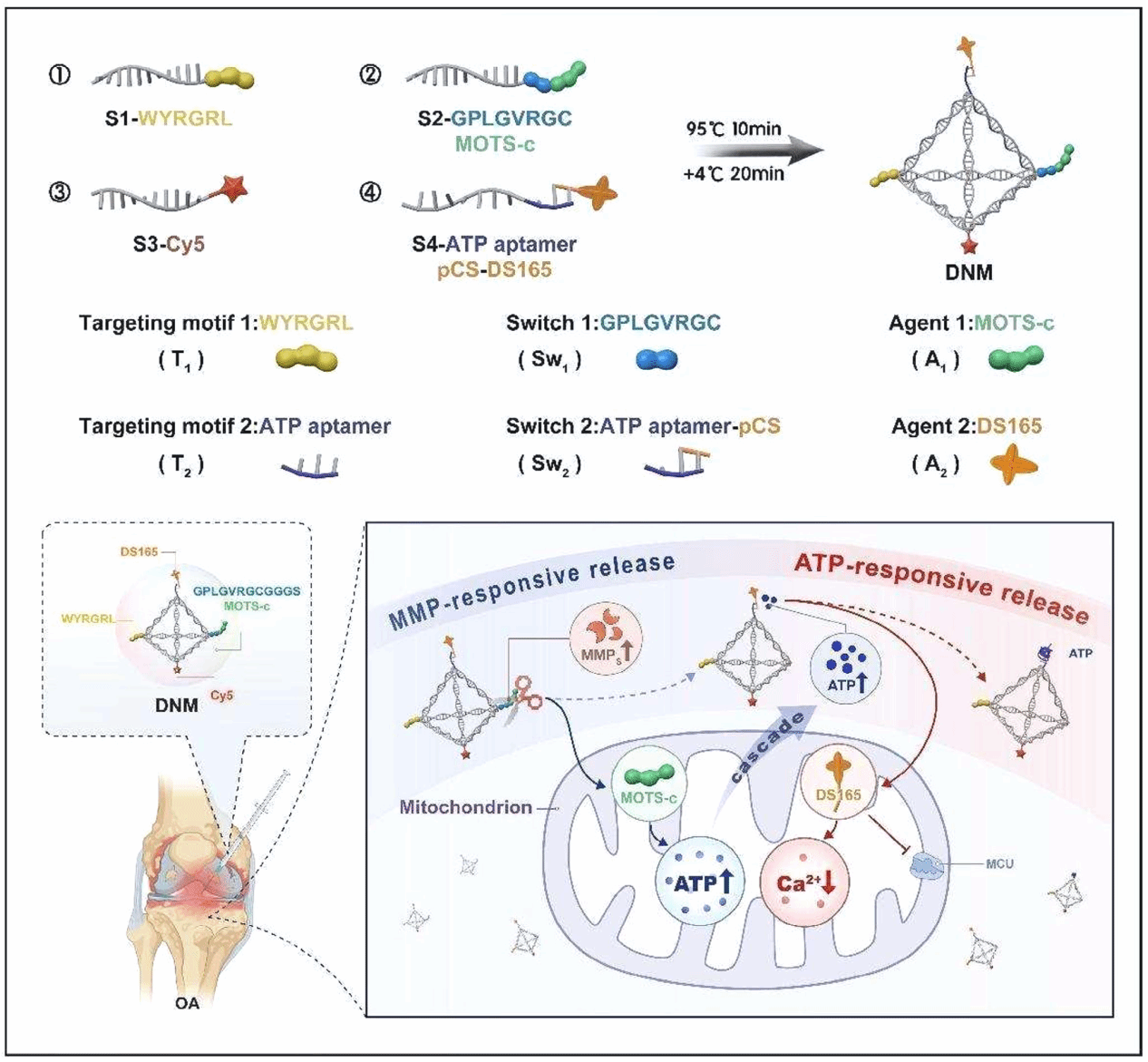 该研究首次构建了一种智能DNA纳米框架载体,通过“双靶向+级联释药”机制精准干预软骨细胞线粒体功能。
