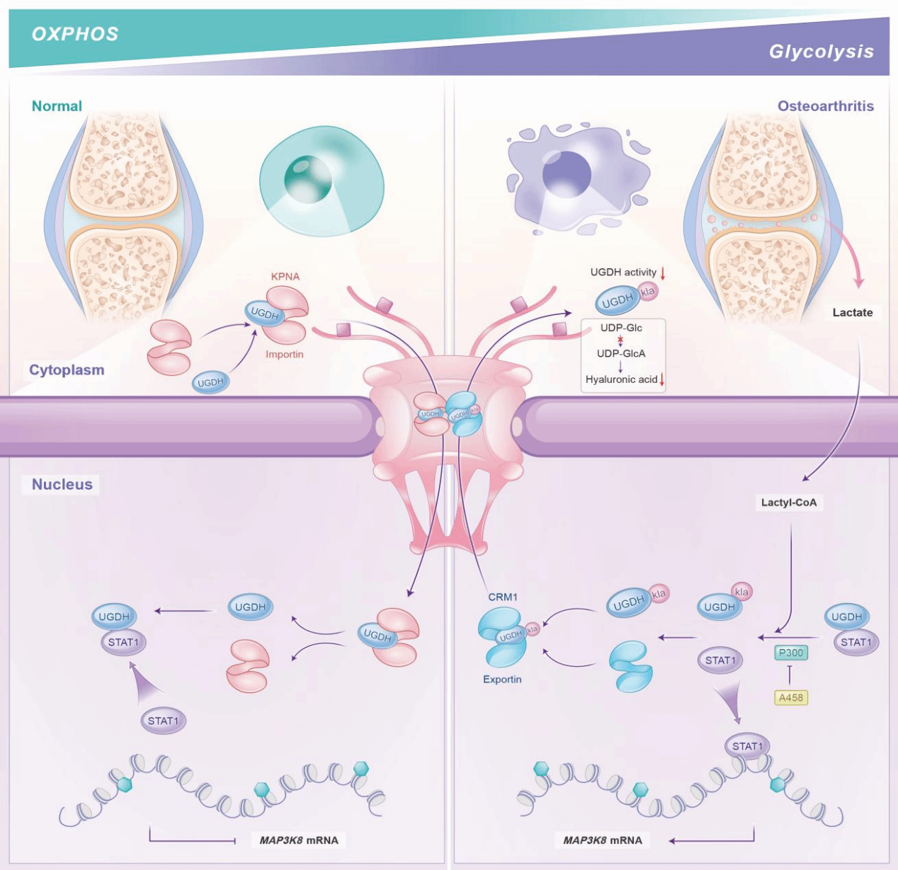 该研究在Advanced Science发表,题为《UGDH Lactylation Aggravates Osteoarthritis by Suppressing Glycosaminoglycan Synthesis and Orchestrating Nucleocytoplasmic Transport to Activate MAPK Signaling》。珠江医院蓝蔚仁为论文第一作者,珠江医院丁长海、汤苏安为通讯作者。