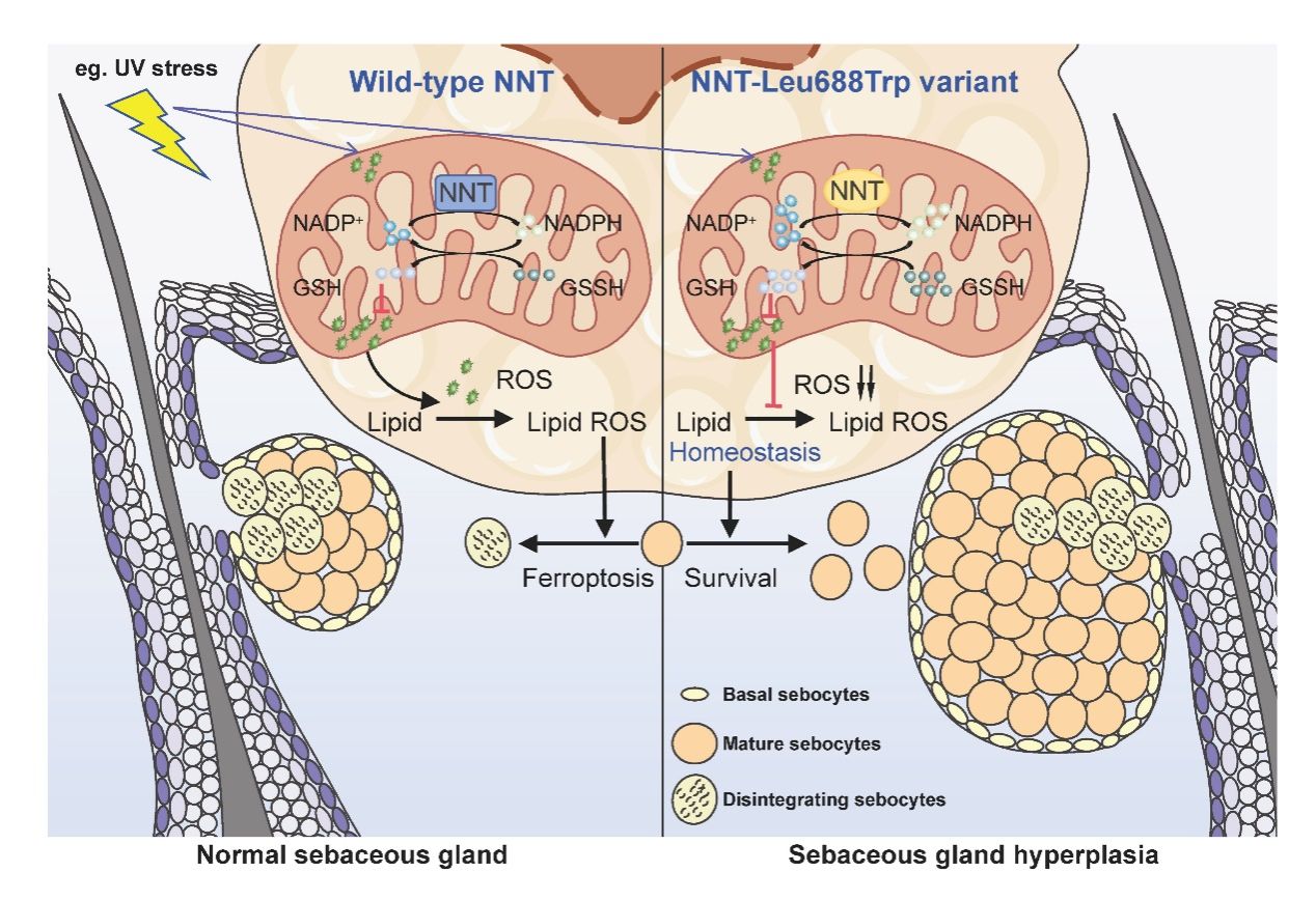 研究团队在三个PDFSH家系中发现,患者的NNT基因发生c.2063T>G(p.Leu688Trp)杂合错义突变。NNT基因编码烟酰胺核苷酸转氢酶,在线粒体内膜负责催化线粒体中NADPH合成,可维持细胞氧化还原的稳态。研究团队发现NNT的Leu688Trp突变显著提升其酶学功能,导致患者来源的角质形成细胞和表达突变型NNT的皮脂腺细胞(SZ95)中NADPH/NADP⁺比率与GSH水平上升,ROS水平则明显下降,细胞抗氧化能力得到了提升。研究者发现NNT Leu688Trp突变的抗氧化能力赋予了皮脂腺细胞抵御铁死亡的能力,成了皮脂腺细胞抵抗全浆分泌的死亡方式的“保护伞”。在患者组织中,研究团队观察到终末分化的皮脂腺细胞内,具有铁死亡特征的线粒体比例显著下降。同时,作为铁死亡的关键标志,患者皮脂腺的脂质过氧化水平也大幅降低。体外实验也证实,表达突变型NNT的SZ95细胞脂质过氧化程度更轻,存活率更高。尽管皮脂腺过度增生会导致患者外观受到一定程度困扰,但其病因背后的抗氧化增强和铁死亡抵抗的生理学现象,可能会为皮肤抗衰老及年轻化研究提供重要思路。