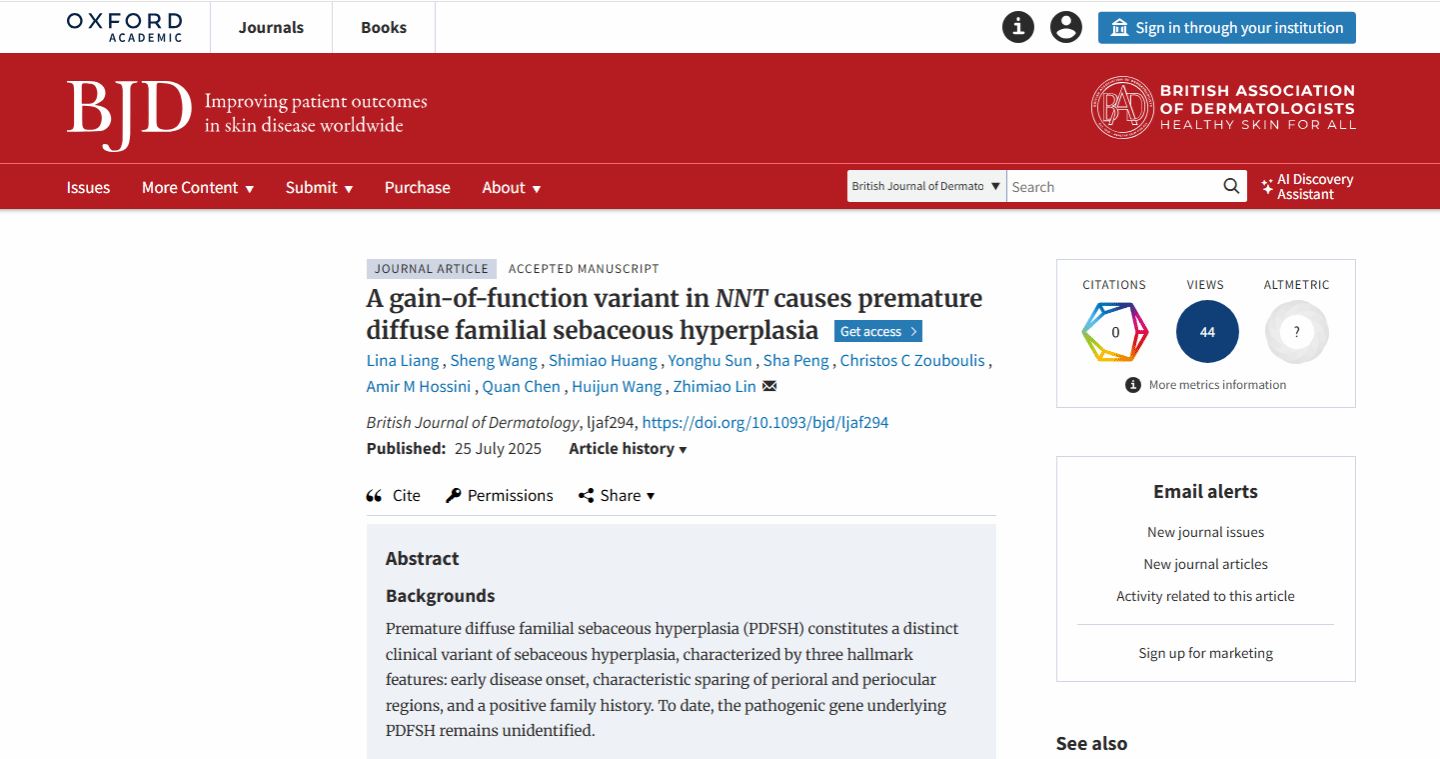 研究成果在British Journal of Dermatology 发表,题为 "A gain-of-function variant in NNT causes premature diffuse familial sebaceous hyperplasia"。研究得到了山东省皮肤病医院教授孙勇虎的支持。皮肤病医院博士梁丽娜与华西医院皮肤科教授汪盛为共同第一作者。皮肤病医院教授林志淼、副研究员汪慧君,以及广州市皮肤病医院教授陈荃担任共同通讯作者。皮肤病医院是该论文的通讯单位。该研究获得国家自然科学基金和南方医科大学皮肤病医院人才基金的支持。