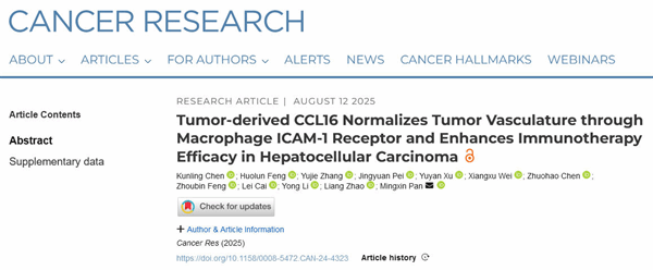该研究首次阐明CCL16-ICAM1-JAK2/STAT6-IL24信号轴在肝癌血管免疫调控中的核心作用;发现DPP4抑制剂西格列汀可通过稳定CCL16促进血管正常化;提出"西格列汀+抗PD-1抗体"联合治疗新策略,为解决肝癌免疫治疗耐药提供新方向。研究成果在国际顶级肿瘤学期刊Cancer Research上在线发表,题为《Tumor-derived CCL16 Normalizes Tumor Vasculature through Macrophage ICAM-1 Receptor and Enhances Immunotherapy Efficacy in Hepatocellular Carcinoma》。珠江医院陈锟灵博士、广东省人民医院冯伙伦博士、南方医院张钰洁博士和珠江医院裴婧源硕士为共同第一作者。