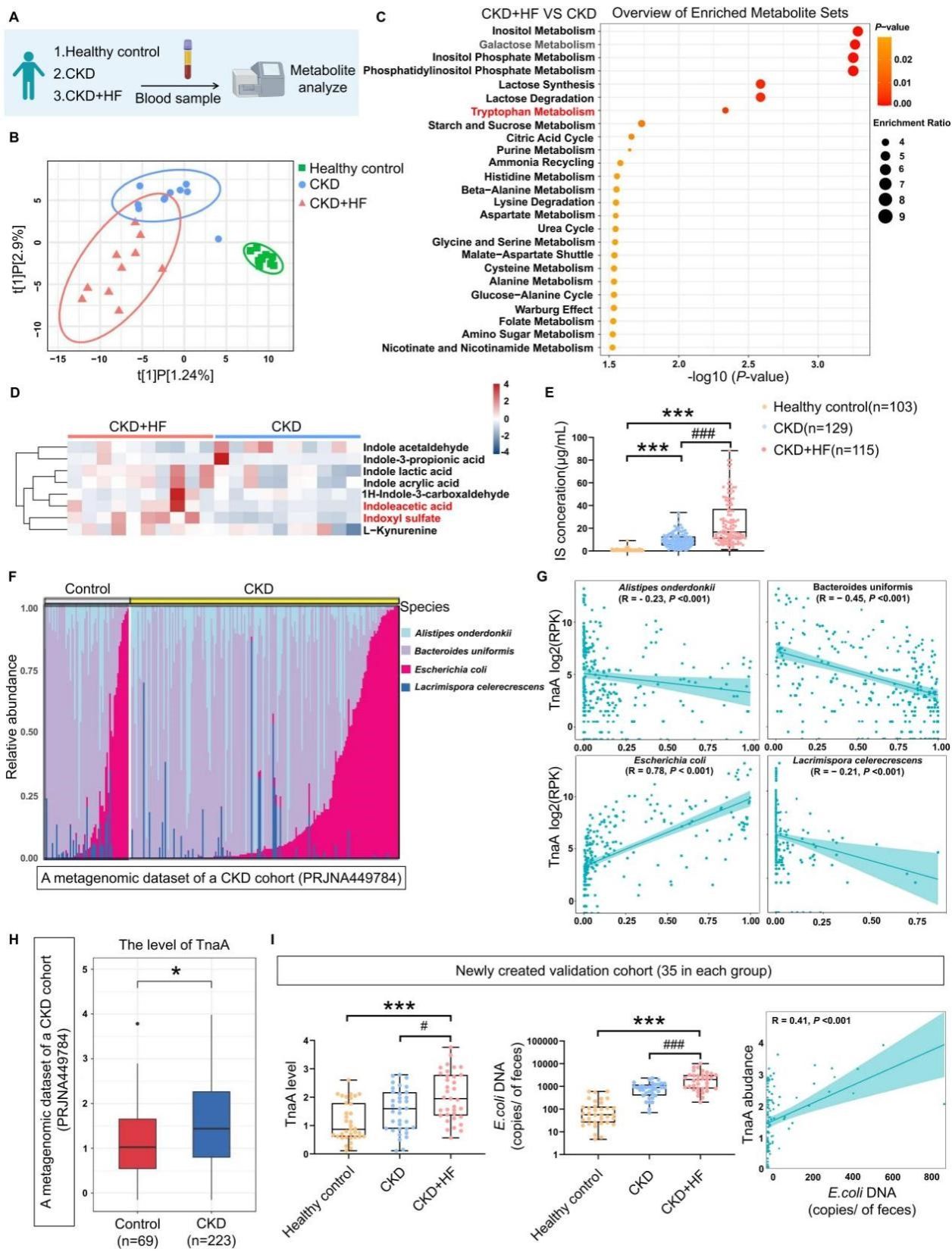 是什么导致硫酸吲哚酚增加?研究人员分析了69名健康人和223名慢性肾病患者的基因数据库,发现大肠杆菌的数量与一种名为TnaA的代谢酶(负责生成硫酸吲哚酚)含量呈正相关,在慢性肾病合并心衰的患者中,TnaA水平和大肠杆菌数量都更高,且两者存在正相关关系。