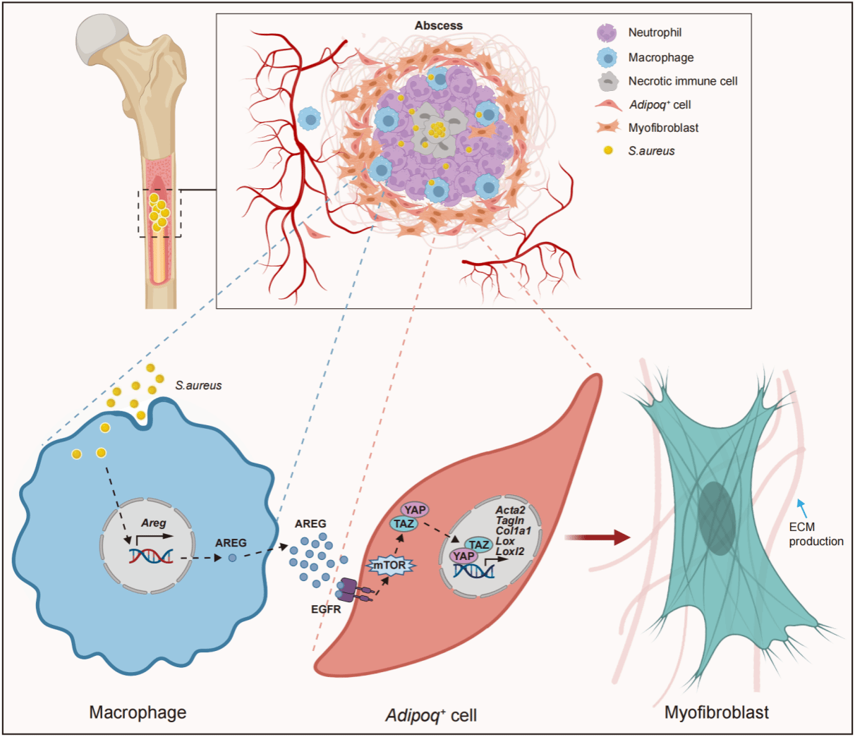 该研究首次系统阐释了骨髓炎中脓肿纤维化形成的细胞与分子通路,提出了靶向AREG-EGFR-mTOR轴联合抗生素的“破纤维化壁垒”治疗新策略。这一发现不仅深化了对感染微环境病理机制的理解,也为难治性骨髓炎的临床治疗提供了具有转化潜力的新方向。