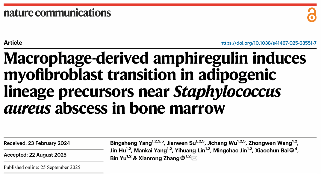 本研究在Nature Communications杂志上发表,题为Macrophage-derived amphiregulin induces myofibroblast transition in adipogenic lineage precursors near Staphylococcus aureus abscess in bone marrow,由南方医科大学南方医院创伤骨科教授张先荣作为通讯作者,南方医科大学珠江医院医师杨炳生、南方医院博士后苏剑文和博士吴继昌为共同第一作者。本研究得到南方医科大学南方医院创伤骨科教授余斌、南方医科大学基础医学院教授白晓春和宾夕法尼亚大学教授秦聆的支持。
