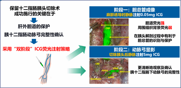 吲哚菁绿(ICG)荧光作为一种可以实时显影胆道和血管的导航技术,是辅助LDPPHR精准执行的有效手段。由于ICG成像质量与注射剂量及时间密切相关,若仅凭术者经验性用药,胆道显影易受到背景组织紊乱的荧光信号干扰,导航价值受限。杨剑教授团队在前期随机对照临床试验(RCT)中证实,麻醉诱导时注射极低剂量(0.05mg) ICG的方案能够在实时增强显影胆道的同时降低周围组织背景荧光的干扰(Journal of the American College of Surgeons,2025;240(3):245-253)。在此研究基础上,团队将“双阶段”荧光导航技术应用于LDPPHR:第一阶段在麻醉诱导时注射0.05mg ICG用于胰头切除过程中实时显影胆总管,避免胆管损伤;第二阶段在胰头完整切除后静脉注射5mg ICG,增强显影胰头动脉弓走行,实现对胆道与十二指肠血供完整性的保护和确认。该策略为LDPPHR的精准、安全执行提供了新的可视化导航方案。