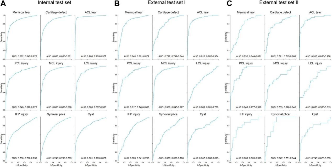 诊断性能方面,在内部测试集中,主要病变(半月板撕裂、软骨缺损、ACL撕裂)的AUC值达到0.898,外部测试集也保持0.852的高水平;九病种准确率内部测试集达到73.1%-95.6%,外部验证集63.3%-89.3%;临床辅助效果显著,辅助医师诊断后,整体准确率提升4.2%-8.8%。