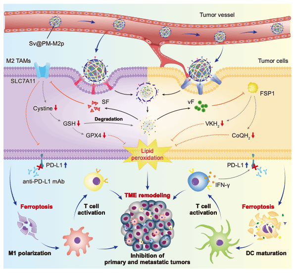 体内外实验证实,Sv@PM-M2p能高效蓄积于肿瘤部位,并被肿瘤细胞与M2 TAM同步摄取。药物释放后,索拉非尼与viFSP1分别抑制GPX4和FSP1两条平行的铁死亡防御通路,协同引发脂质过氧化物的大量累积,最终导致肿瘤细胞与M2 TAM发生双重铁死亡。这一过程不仅直接清除肿瘤细胞,还通过耗竭免疫抑制性的M2 TAM、促进其向抗肿瘤M1表型复极、释放损伤相关分子模式分子激活树突细胞与细胞毒性T细胞,将“冷”肿瘤逆转为“热”肿瘤,重塑了肿瘤免疫微环境。