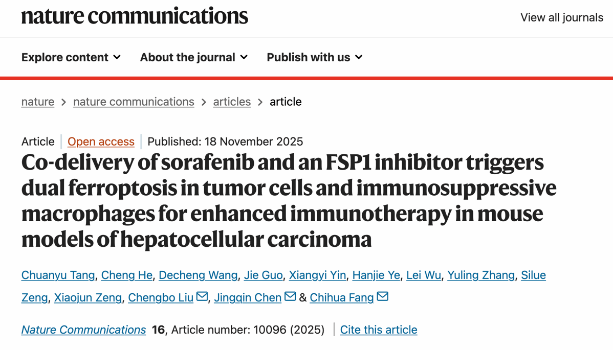 该研究在国际权威期刊Nature Communications上发表,题为“Co-delivery of sorafenib and an FSP1 inhibitor triggers dual ferroptosis in tumor cells and immunosuppressive macrophages for enhanced immunotherapy in mouse models of hepatocellular carcinoma”。方驰华、陈敬钦、刘成波为论文通讯作者,唐传宇为论文第一作者。该研究获得国家重点研发计划、国家自然科学基金委、医学成像科学与技术系统全国重点实验室、中国科学院青促会、广东省基础与应用基础研究基金委、深圳市科技计划等项目支持。