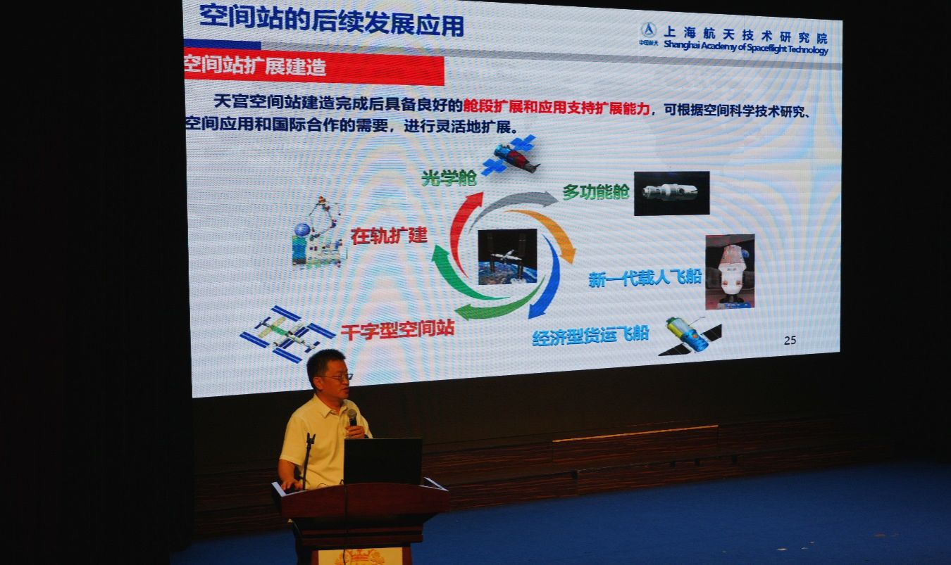 罗斌以《中国空间站建造的历史和发展》为题,通过梦天实验舱发射任务宣传片,带领师生回顾中国载人航天三十年的艰辛探索。他系统梳理了飞行器、运载火箭、两大发射场的技术演进,并生动介绍了28名航天飞行员、工程师的奋斗故事。