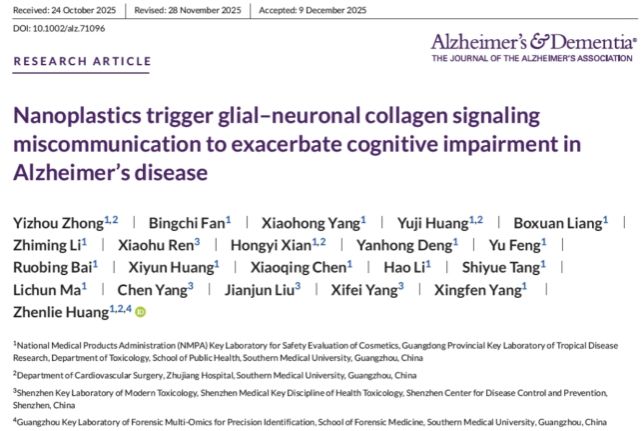 该研究成果在临床神经病学国际顶级期刊 《Alzheimer’s & Dementia》在线发表,题为 “Nanoplastics trigger glial–neuronal collagen signaling miscommunication to exacerbate cognitive impairment in Alzheimer’s disease” 。南方医科大学博士后钟怡洲、2022级硕士生范冰驰、2025级博士生杨萧鸿、讲师黄煜基为本文共同第一作者,黄振烈为独立通讯作者,南方医科大学为论文第一署名单位。