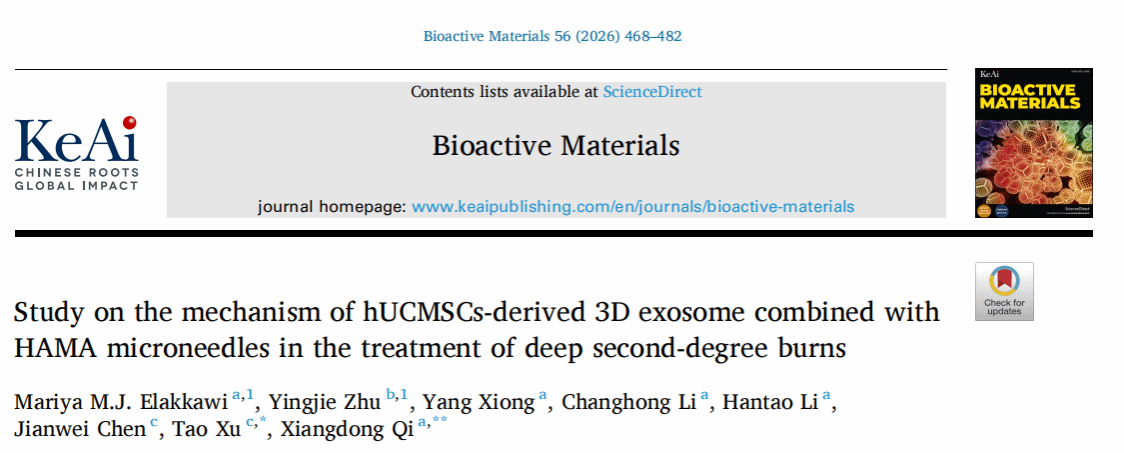 这项兼具创新性与临床转化价值的成果被国际知名期刊《Bioactive Materials》收录,以“Study on the mechanism of hUCMSCs-derived 3D exosome combined with HAMA microneedles in the treatment of deep second-degree burns”为题,Elakkawi Mariya M. J为第一作者,齐向东为第一通讯作者。成为第二临床医学院当期收录论文中影响因子最高的一篇。