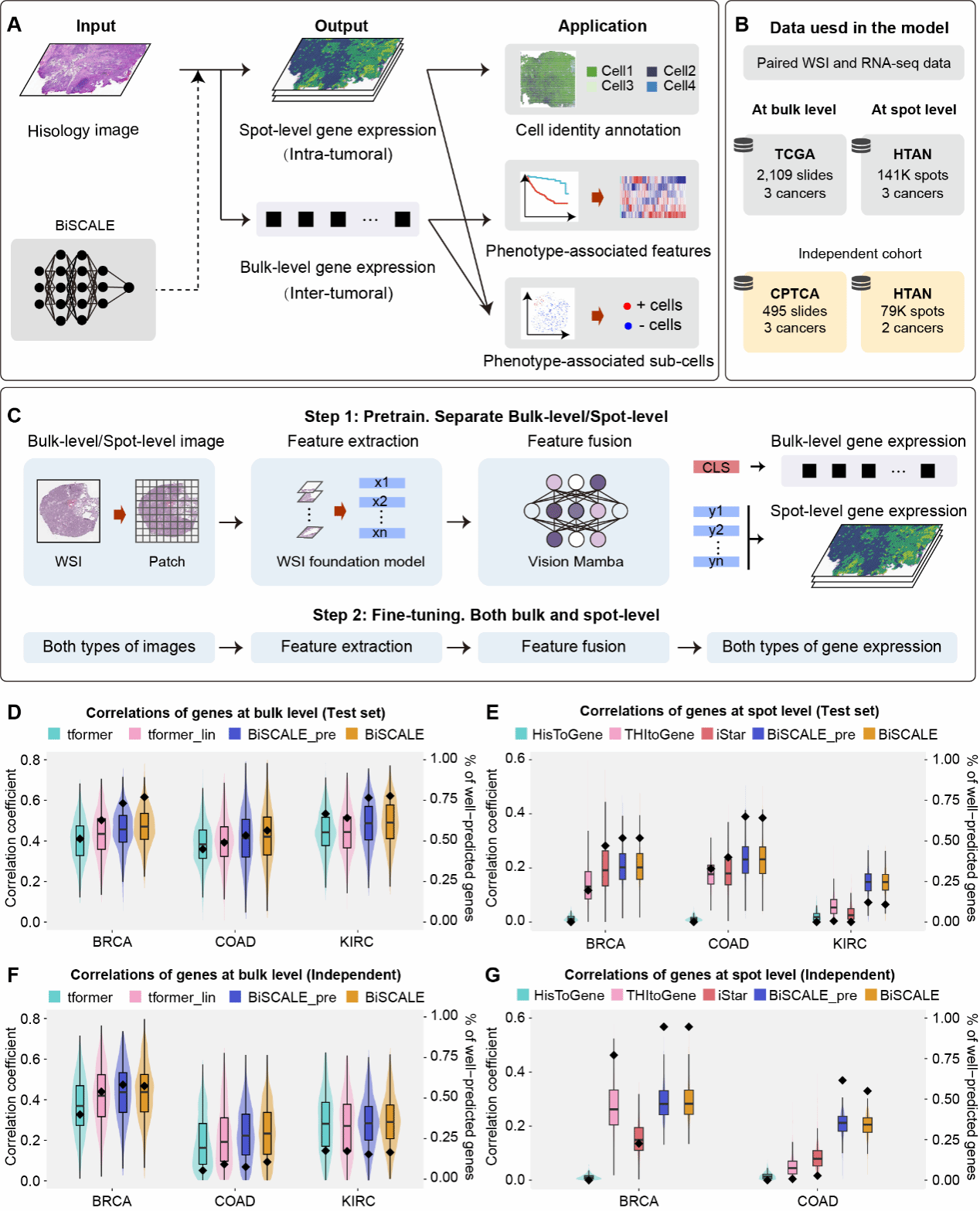 肿瘤内部存在明显异质性,不同区域的细胞状态和分子特征往往并不相同。识别与疾病进展、复发风险和治疗反应相关的细胞亚群,对于准确判断病情、发现预后标志物和制定针对性治疗方案具有重要意义。然而,这类分析通常依赖额外分子检测,成本较高,应用也受到一定限制。针对这一问题,研究团队提出了基于常规病理全切片图像的多尺度基因表达预测框架BiSCALE,尝试同时预测组织尺度和近细胞尺度的基因表达信息。