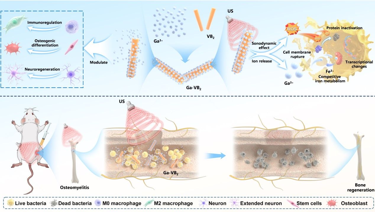 Ga-VB2纳米平台超声响应抗菌及其神经与骨再生机制示意图