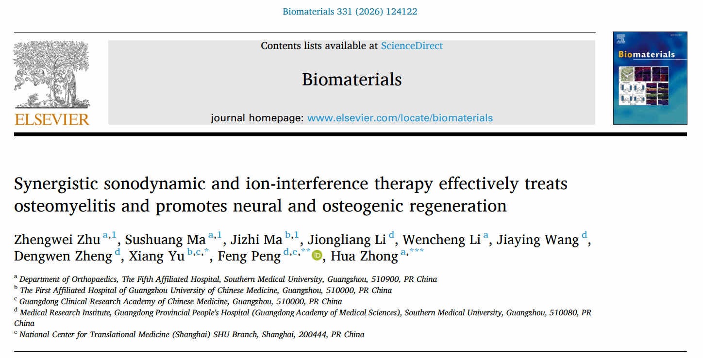 相关研究成果以“Synergistic sonodynamic and ion-interference therapy effectively treats osteomyelitis and promotes neural and osteogenic regeneration”为题,在线发表于Biomaterials。其中,钟华骨科学术型硕士研究生朱正伟为第一作者,创伤骨科马肃霜为共同第一作者,钟华为末位通讯作者。
