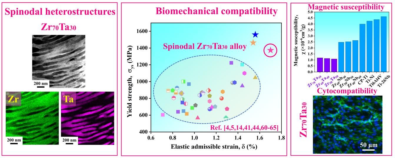 调幅异质结构Zr-Ta合金提升力学相容性,磁共振兼容性及生物安全性示意图