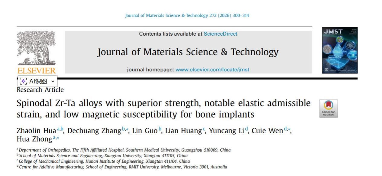 该研究从微观结构设计出发,系统探索了Zr-Ta合金在力学性能、磁共振兼容性及生物安全性方面的综合优势,为难治性骨缺损修复提供了新的材料选择思路。相关研究成果以“Spinodal Zr-Ta alloys with superior strength, notable elastic admissible strain, and low magnetic susceptibility for bone implants”为题,在线发表于国际权威期刊 Journal of Materials Science & Technology,第五附属医院创伤骨科博士后花照林为论文第一作者,钟华为末位通讯作者。