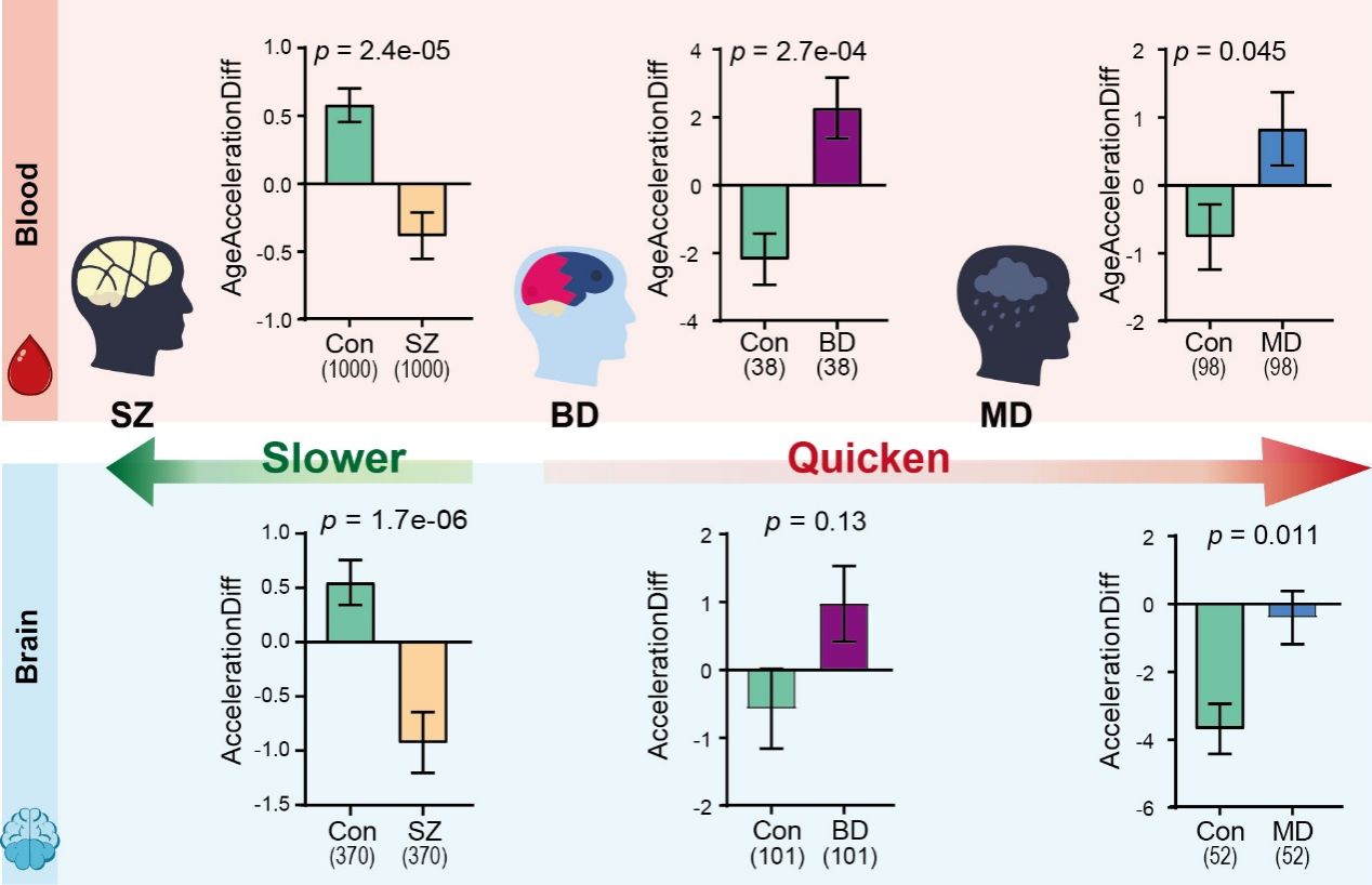 在此基础上,团队针对LINC02449–CPLX1致病轴,利用已上市药物利鲁唑进行干预,在分子、环路及行为层面实现系统性纠正,证明遗传驱动的脑功能异常具有可干预性。这一结果以Riluzole Restores Circuit and Behavioral Function Altered by Allele-Specific Expression-Mediated LINC02449–CPLX1 Dysregulation为题发表在Schizophrenia bulletin (2026)。在精准诊断方面,团队还构建首个“血液—脑组织”统一的表观遗传时钟模型,揭示精神分裂症表现为发育迟滞,双相情感障碍与抑郁症呈现加速衰老,这些变化可在外周血中检测,具有早期预警与分型潜力(图3)。相关成果以Recalibrating the epigenetic clock reveals divergent DNA methylation age signatures across schizophrenia, bipolar disorder and major depressive disorder 为题发表在The British Journal of Psychiatry(2026)。