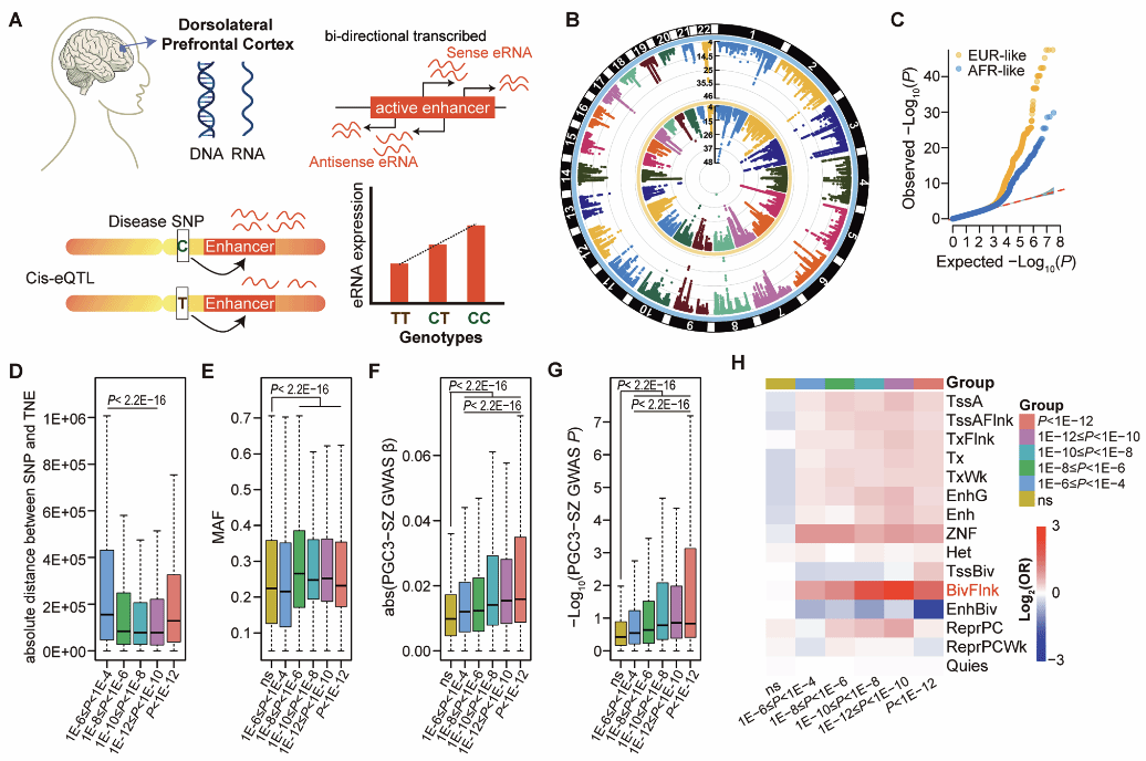 进一步研究揭示:非编码变异可通过等位基因偏好性结合转录因子SMC3和CEBPB,驱动lncRNA PAXIP1-AS1异常表达,调控突触相关基因,引发神经功能及行为异常。成果以“Allele-Specific Regulation of PAXIP1-AS1 by SMC3/CEBPB at rs112651172 in Psychiatric Disorders Drives Synaptic and Behavioral Dysfunctions in Mice”为题发表在Advanced Science(2025)。团队还构建增强子RNA调控图谱,结合孟德尔随机化分析,揭示非编码调控元件在精神分裂症中的潜在因果作用(图2)。成果以“Mendelian randomization facilitates identification of schizophrenia risk enhancer RNAs”为题发表在Molecular Psychiatry(2025)。系列研究共同指向非编码调控是精神疾病的重要分子基础。