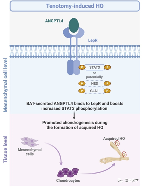 本研究揭示了肌腱断裂术后,由BAT合成并分泌的ANGPTL4在HO部位结合PRRX1+间充质干细胞上的LepR,从而促进软骨形成的过程。研究结果为靶向治疗获得性HO疾病提供了新思路。