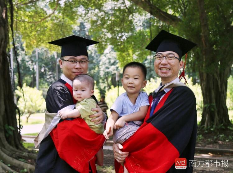 据记者了解,照片中的两位博士是同门师兄弟,右为卢凤飞师兄,左为叶勇义师弟,同在南方医科大学珠江医院读神经外科专业,师从张世忠教授,今年一同毕业,卢师兄是工作后读的博士,宝宝已经3岁,而叶师弟则是硕博连读,宝宝才7个月,两位博士在毕业当天携妻子和宝宝一同拍毕业照,令人艳羡。