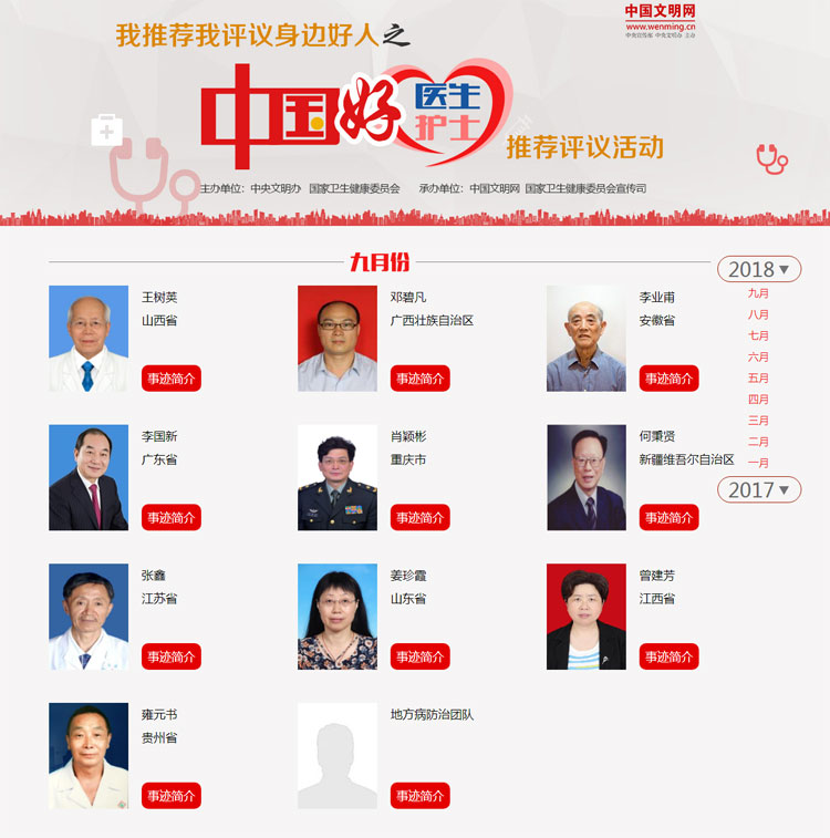 2018年9月,由中央文明办和国家卫生健康委员会共同组织的“中国好医生、中国好护士”网络推荐评议活动,经过群众推荐、集中展示、点赞评议等环节,共有10位优秀医务人员和1个团队入选9月月度人物,他们分别为(以姓氏笔画为序):