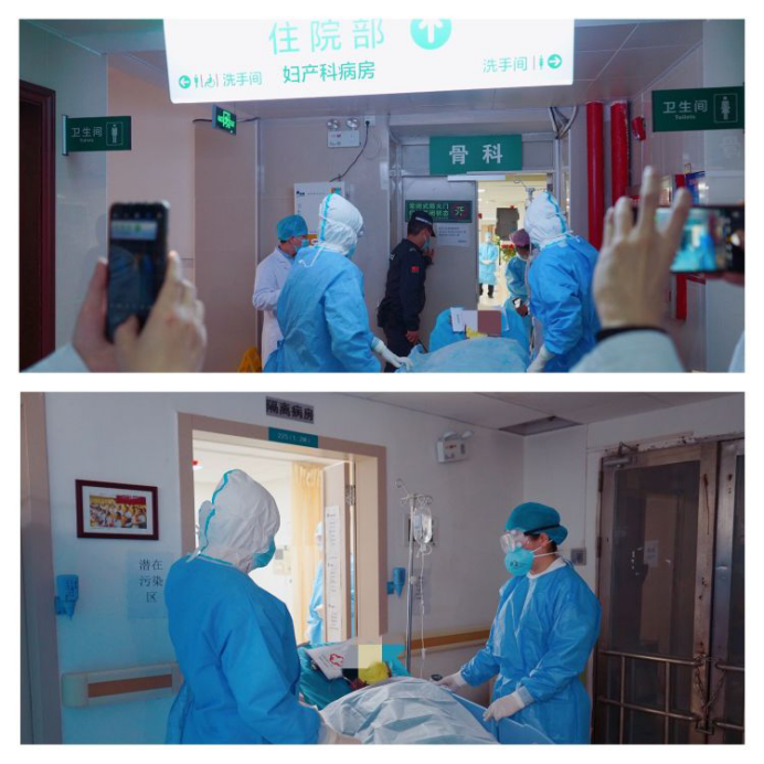现场演练场景:院前科接120电话称,一名2天前从湖北来深的发热患者,半小时前左下肢受伤疼痛出血,需要紧急救治。院前科、急诊科立即启用“新冠肺炎疑似病例”抢救预案,完成疑似病例的上报、抢救、会诊、核酸检测取样、CT检查流程。急诊科送患者至放射科CT检查,放射科完成“新冠肺炎疑似病例”检查流程。患者检查完毕返回急诊科,完成术前谈话和术前准备工作。骨科送患者至手术室急诊手术,手术完成“新冠肺炎疑似病例”手术流程。麻醉科送患者至骨科,骨科完成“新冠肺炎疑似病例”收治流程。