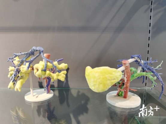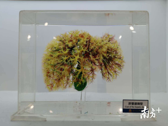 这里是肝管道铸型,绿色的东西代表着胆囊,肝脏每天分泌胆汁,会先储存在胆囊里。如果我们不吃早饭,胆汁就会越积越多,对肝非常不好哦~