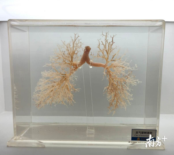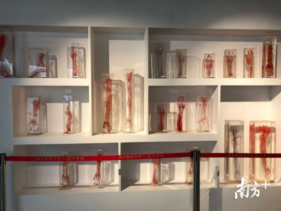 现在我们来到的是精品展厅,这些像工艺品一样的标本,看上去像是一棵棵彩色的树,但其实,那都是人体中的血管组织。白色代表气管、支气管,红色代表动脉,蓝色代表静脉。连只有几微米的毛细血管都纤毫毕现。这是运用了“数字人之父”钟世镇院士发明管道铸型技术制作的,这个技术获得了2000年国家科技进步二等奖,也是古老学科解剖学界最高的奖项。