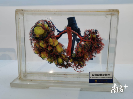 这是双肾动静脉铸型标本,这里的蓝色是静脉,红色是动脉,黄色如石头一般的结块是肾结石。肾结石是晶体物质(如钙、草酸、尿酸、胱氨酸等)在肾脏的异常聚积所致,为泌尿系统的常见病、多发病,男性发病多于女性,多发生于青壮年。缺乏运动、不良的饮食习惯都有可能会诱发肾结石。