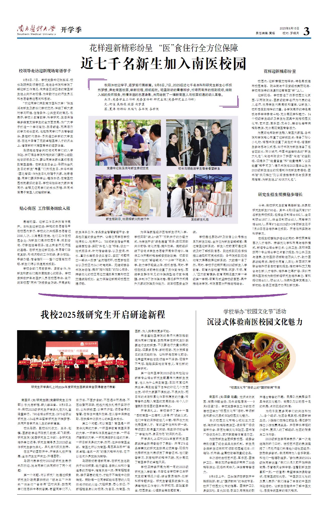秋阳沐校迎学子,逐梦笃行展新篇。9月6日、7日,2025级近七千名本科和研究生新生心怀炽热梦想,奔赴南医校园,崭新征程,扬帆起航。轻盈跃动的青春脚步,忙碌而有序的报到现场,细致入微的关怀服务,热情洋溢的志愿身影,共同绘就了一幅新南医人与校园初遇的动人画卷。