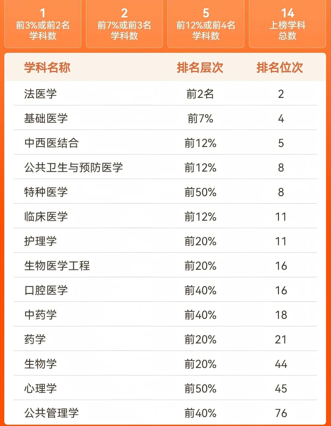 其中,法医学一级学科首次参加软科排名,我校位列全国第2,入围“中国顶尖学科”行列,系广东省进入榜单的9个顶尖学科之一。我校基础医学全国排名第4,入围“中国一流学科(前7%)”,临床医学、公共卫生与预防医学和中西医结合入围“中国一流学科(前12%)”。