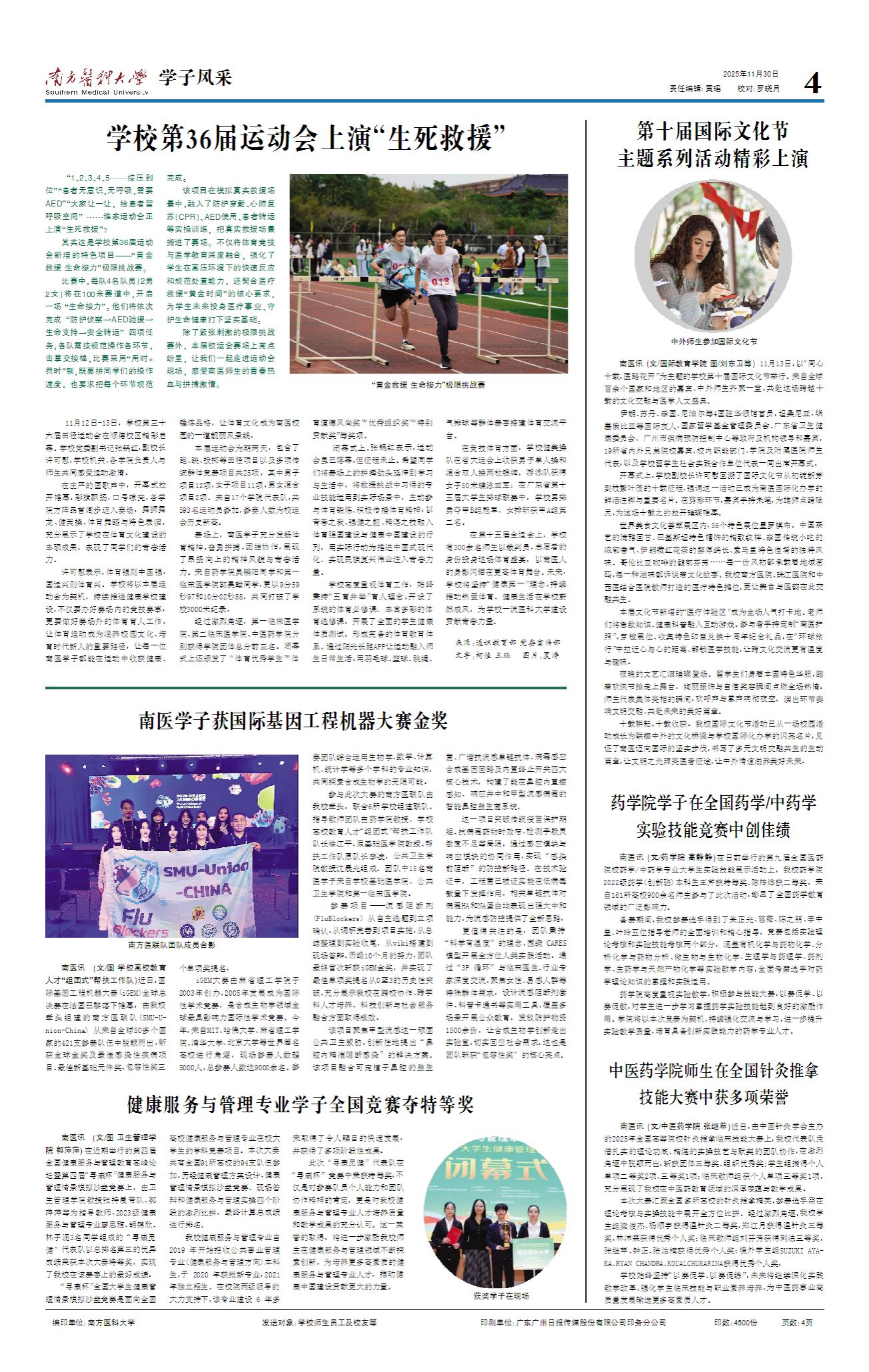 在第十五届全运会上,学校有300余名师生以裁判员、志愿者的身份投身这场体育盛宴,以南医人的身影闪耀在更高体育舞台。未来,学校将坚持“健康第一”理念,持续推动热爱体育、健康生活在学校蔚然成风,为学校一流医科大学建设贡献青春力量。