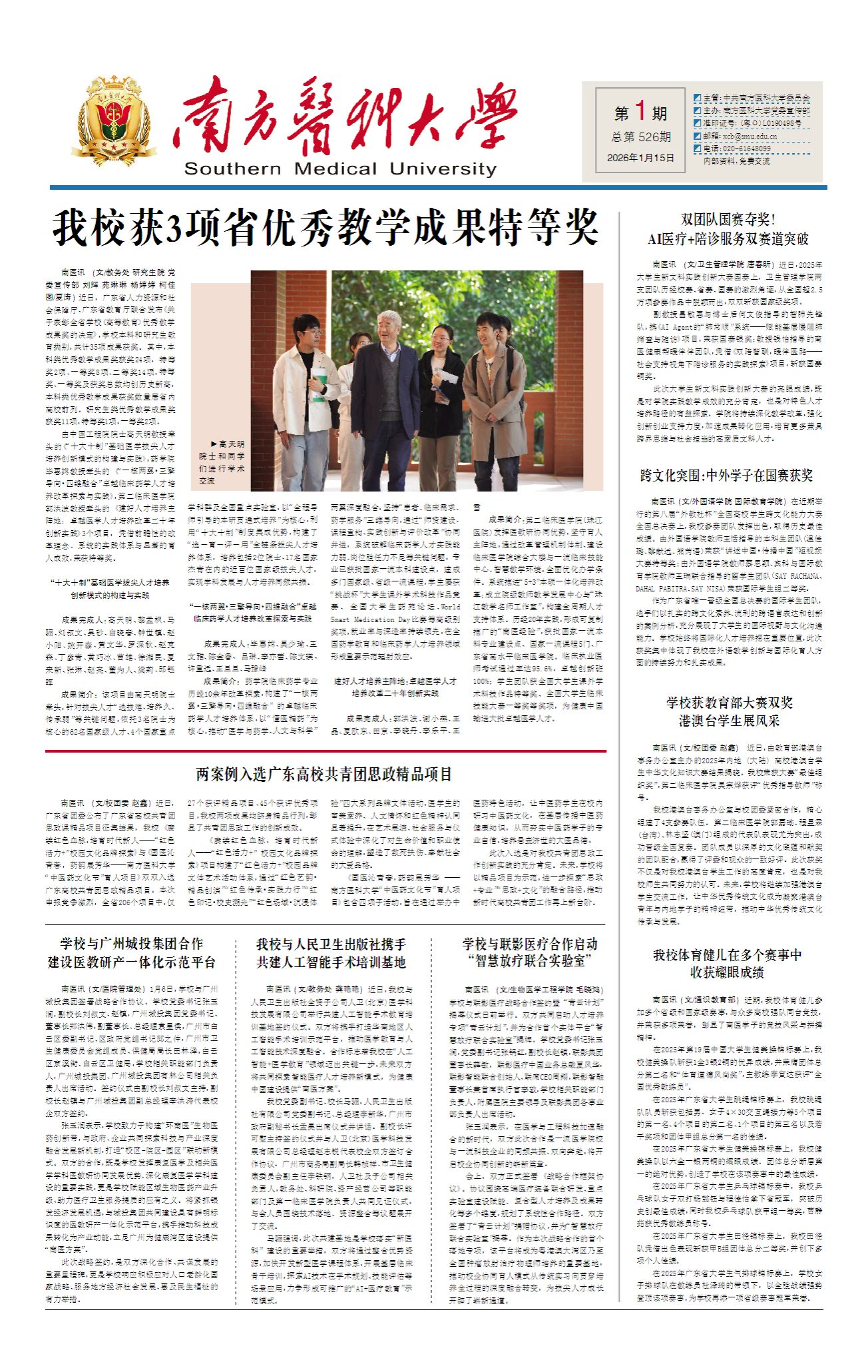 成果简介:第二临床医学院(珠江医院)发挥医教研协同优势,坚守育人主阵地,通过改革管理机制体制、建设临床医学院综合大楼与一流临床技能中心、智慧教学环境,全面优化办学条件。系统推进“5+3”本硕一体化培养改革;成立院级教师教学发展中心与“珠江教学名师工作室”,构建全周期人才支持体系。历经20年实践,形成可复制推广的“南医经验”,获批国家一流本科专业建设点、国家一流课程5门、广东省高水平临床医学院。临床执业医师考试通过率达95.6%,卓越创新班100%;学生团队获全国大学生课外学术科技作品特等奖、全国大学生临床技能大赛一等奖等奖项,为健康中国输送大批卓越医学人才。