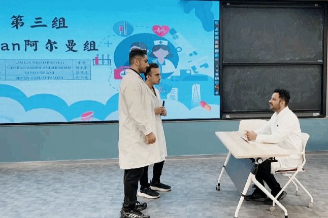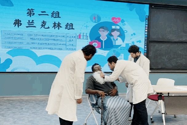 七支队伍进入决赛,参赛队伍围绕心绞痛、冠心病、肾病综合征、急性非淋巴细胞白血病、甲亢等医学病例展开创作与表演。比赛现场亮点纷呈,弗兰克林(Gikunda Frankline Koome)小组通过肾病综合征病例,展现了医学生对病患的人文关怀;木兰(Hussein Amena Abdulfattah Mohammed)小组则以甲亢病例为切入点,用深情的表演诠释医护人员的责任担当;陈佩佩(Pratum Natchanan)小组聚焦冠心病患者的救治过程,巧妙化解医患沟通难题。尤为引人注目的是,阿尔曼(Seyed Ahmad Taslimi)、小美(Kabiri Negar)、吕世英(Lu Shiying)等小组不约而同以“急性非淋巴细胞白血病”为表演主题,通过不同视角诠释这一疾病的诊疗与人文关怀,展现出跨文化理解的深度与创意。恰如阿尔曼小组发出的心声:“愿每一位病人早日康复,我们也会不忘初心,做最温暖的医生!”