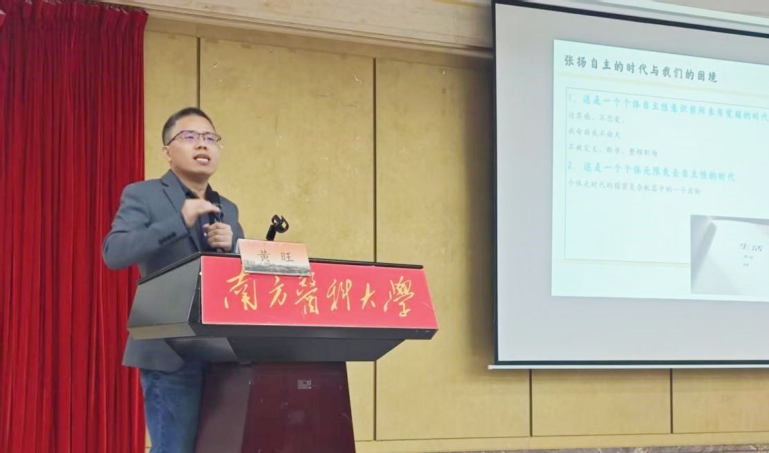 10月23日晚,由通识教育部与德风书院联合主办的第 46 期“通识讲坛”在顺德校区顺利举行。我校马克思主义学院教授黄旺以“我们今天如何做自己”为主题,从哲学维度切入,通过理论解析与案例阐释,为青年学子搭建起"日常困惑"与"哲学思考"的桥梁,现场座无虚席,互动氛围热烈。