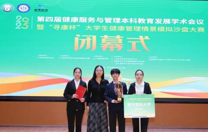 10月25日-26日,第四届全国健康服务与管理教育高峰论坛暨第四届“寻康杯”健康服务与管理情景模拟沙盘竞赛上,由卫生管理学院教授张持晨带队、郭萍萍等为指导教师、2023级健康服务与管理专业廖思雅、胡锦欣、林子涵3名同学共同组成的“寻康觅健”代表队以总排名第三的优异成绩荣获本次大赛特等奖,实现了我校在该赛事上的最好成绩。