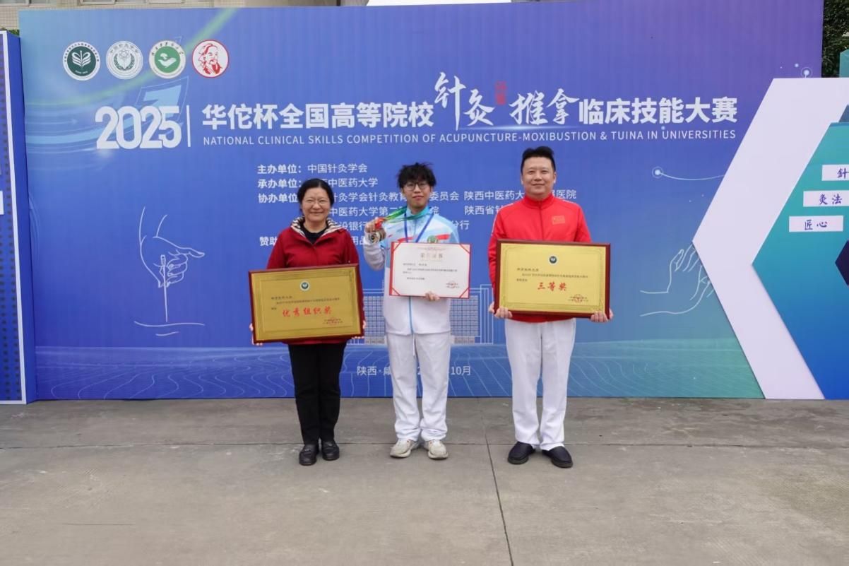 近日,由中国针灸学会主办、陕西中医药大学承办的2025年全国高等院校针灸推拿临床技能大赛上,我校代表队凭借扎实的理论功底、精湛的实操技艺与默契的团队协作,在激烈角逐中脱颖而出,斩获团体三等奖、组织优秀奖;学生组摘得个人单项二等奖2项、三等奖1项;临床教师组获个人单项三等奖1项,充分展现了我校在中医药教育领域的深厚底蕴与教学成果。