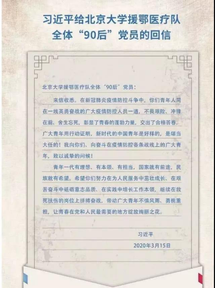 看了习近平主席给北京大学援鄂医疗队90后党员的回信,很是感动!一是我们有共产党的坚强领导和有不忘初心牢记使命的具有高执政能力的领袖。二是有像90后医疗队那样的广大科技人员和各行各业创业青年,他们有理想、有知识、有追求、有责任、勇于担当,他们不怕困难、不怕牺牲、砥砺前行,在疫情期间,“没关系,我是党员”“我年轻,多做点是应该的”“没什么,这是我应该做的”渐渐成为了他们的口头禅,他们冲锋在前,勇挑重担,彰显了新一代党员的本色!这是中华民族伟大复兴路上的中坚力量。实现中华民族的伟大复兴指日可待!