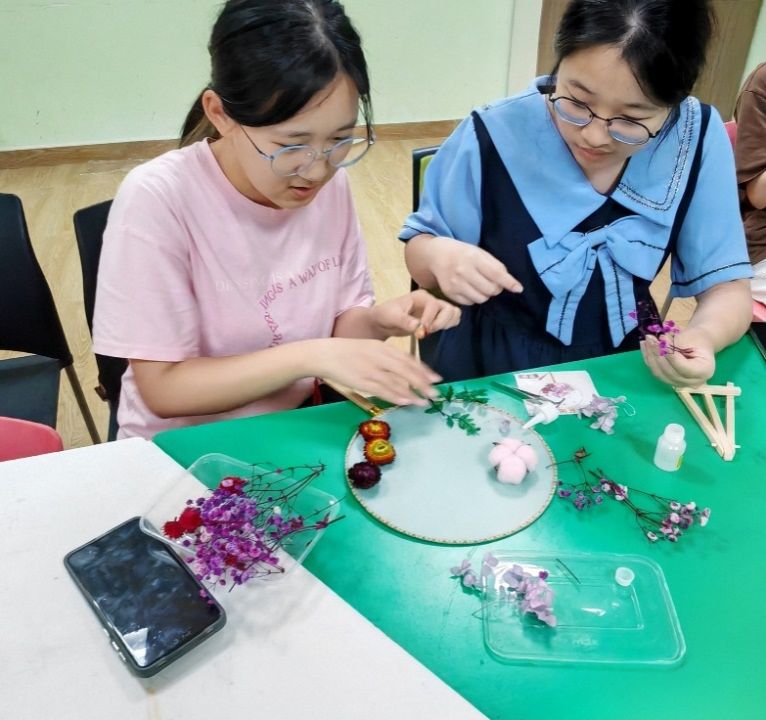 在“团扇雅韵”活动中,同学们在王映婷同学的指导下,以团扇为媒,融自然之美于传统工艺。从花枝选材到布局构思,每一处细节都凝聚着创作者的巧思。活动现场,同学们专注地将叶片与花瓣粘贴于扇面,原本素雅的团扇逐渐焕发出春日的生机。