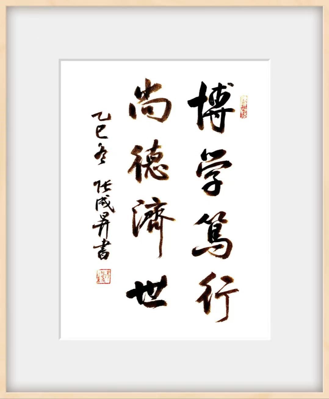 展览深度契合我校“立德树人”根本任务,将“博学笃行,尚德济世”的校训精神融入创作肌理。作品既彰显中华文化的传承创新,又体现学校传播主流价值、服务社会的文化担当。互动区域成为展览亮点,张成生先生与学生现场挥毫,细致讲解执笔运腕之法,示范笔墨运用之道;同学们热情临摹校训,墨香氤氲中艺术交流氛围浓厚。张成生还向学生代表赠送百幅书法作品,勉励青年践行校训、矢志报国,将活动推向高潮。