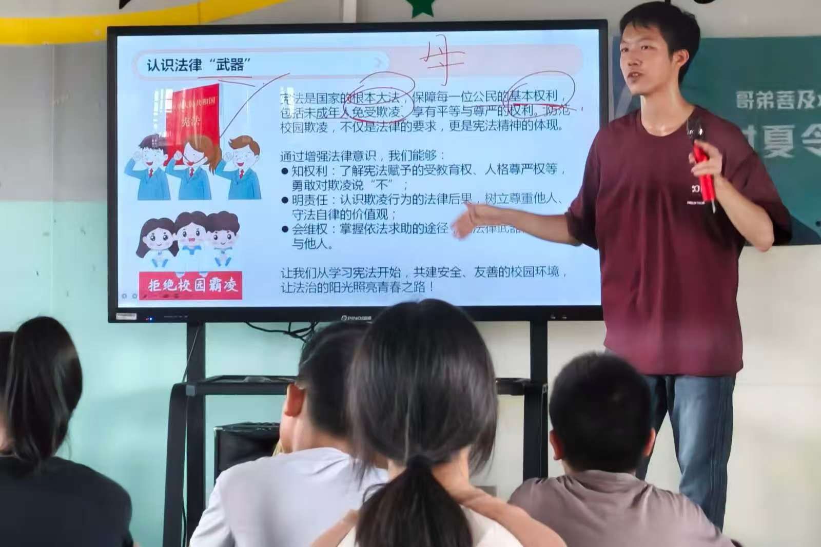 “法学知识不应只停留在书本,更要扎根生活土壤。”在乡村夏令营中,他专门开设普法小课堂,以生动案例解读宪法精神,用通俗语言讲解防范校园欺凌的法律知识,让法治的种子在孩子们心中生根发芽。他坚信,法律不仅是守护青春的坚实“武器”,更是点亮未来的“明灯”。