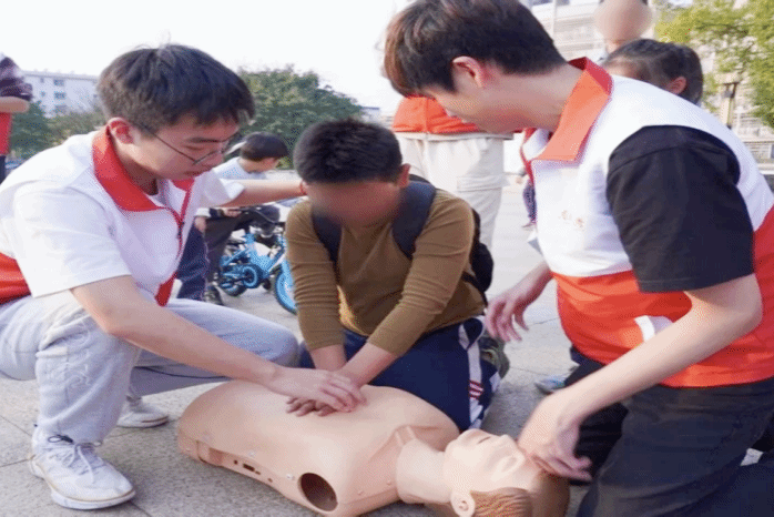 急救科普情景剧演绎心肺复苏时,人群里一个七八岁的小男孩格外专注。他站在最前排,眼睛一眨不眨地盯着队员的每一个动作。按压的位置、力度,开放气道的姿势,他都看得入神。队友问他学会了嘛,他有些腼腆,但声音很坚定的说,“今天的急救知识我都记住啦,以后如果遇到有人需要帮助,我也想像你们一样救人。”
