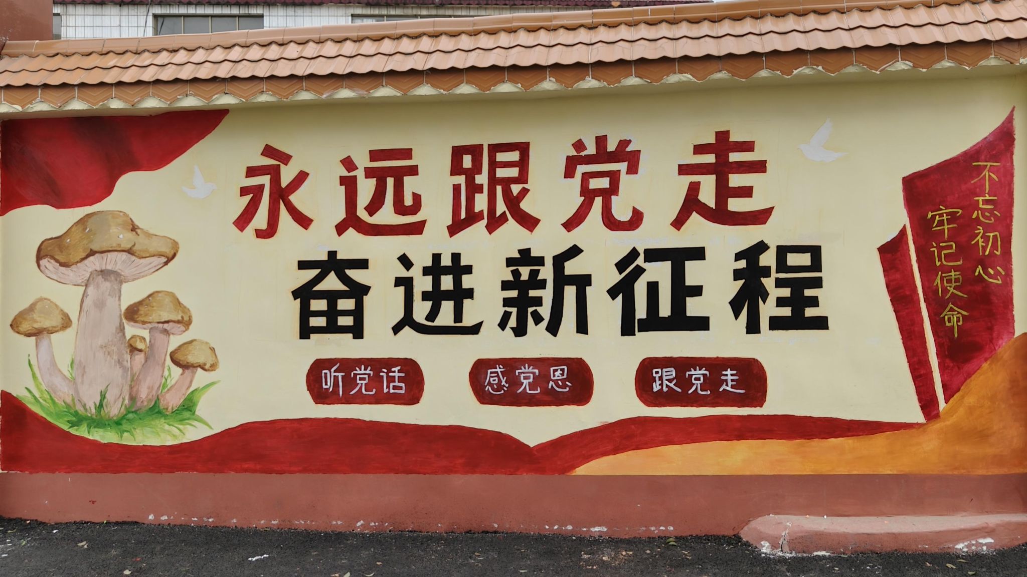 此次墙绘创作,我们深入挖掘马坝特色,将当地标志性的茶树菇产业与大涌泉建筑融入画面。墙上的茶树菇栩栩如生,正如当地的茶树菇产业稳步发展,释放绿色发展红利,实现从“生态颜值”到“经济价值”的提升,我想,这便是绿美赋能的生动写照吧。“大涌泉”是生命之源,滋养着每一位乐村坪村的居民,村民们对它的守护,也正是对绿美广东生态建设最朴素的实践。